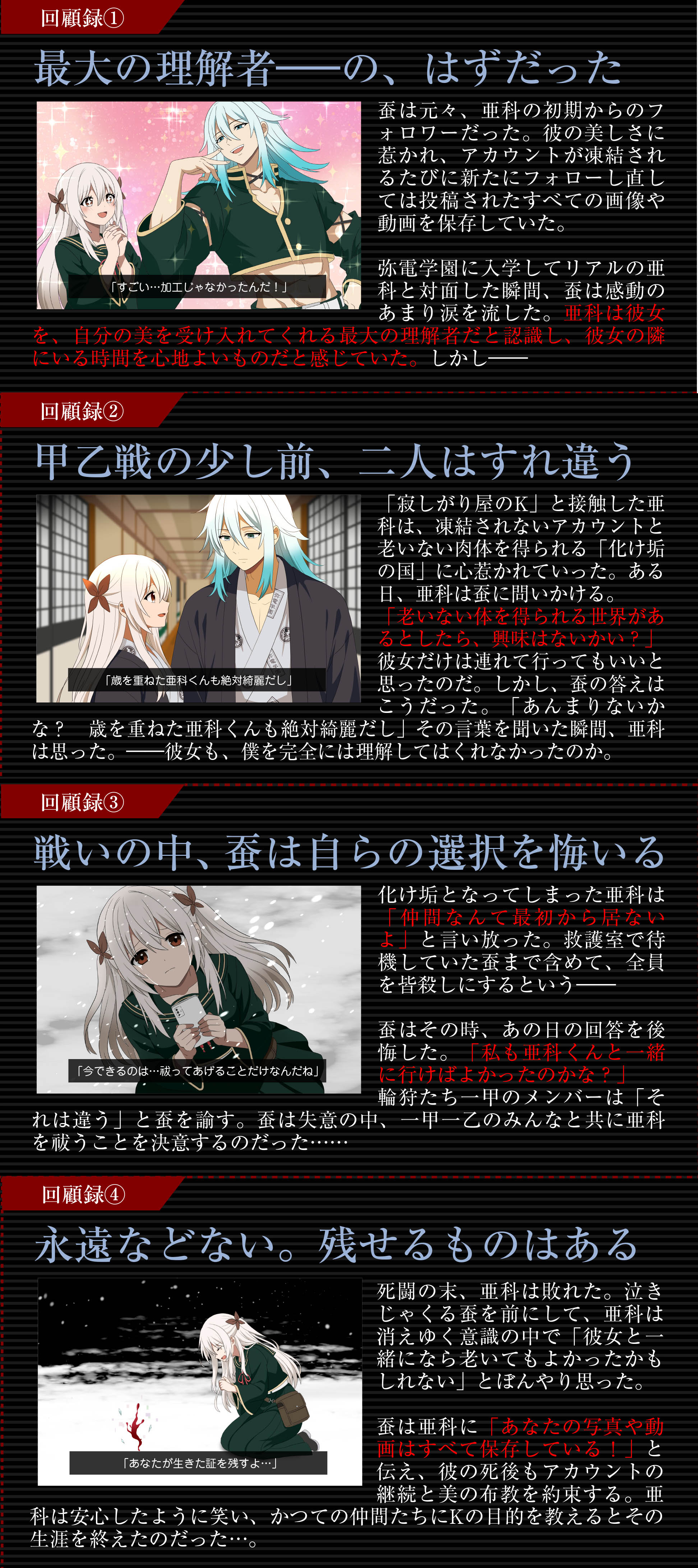 亜科は安心したように笑い、かつての仲間たちにKの目的を教えると、その生涯を閉じたのだった…。